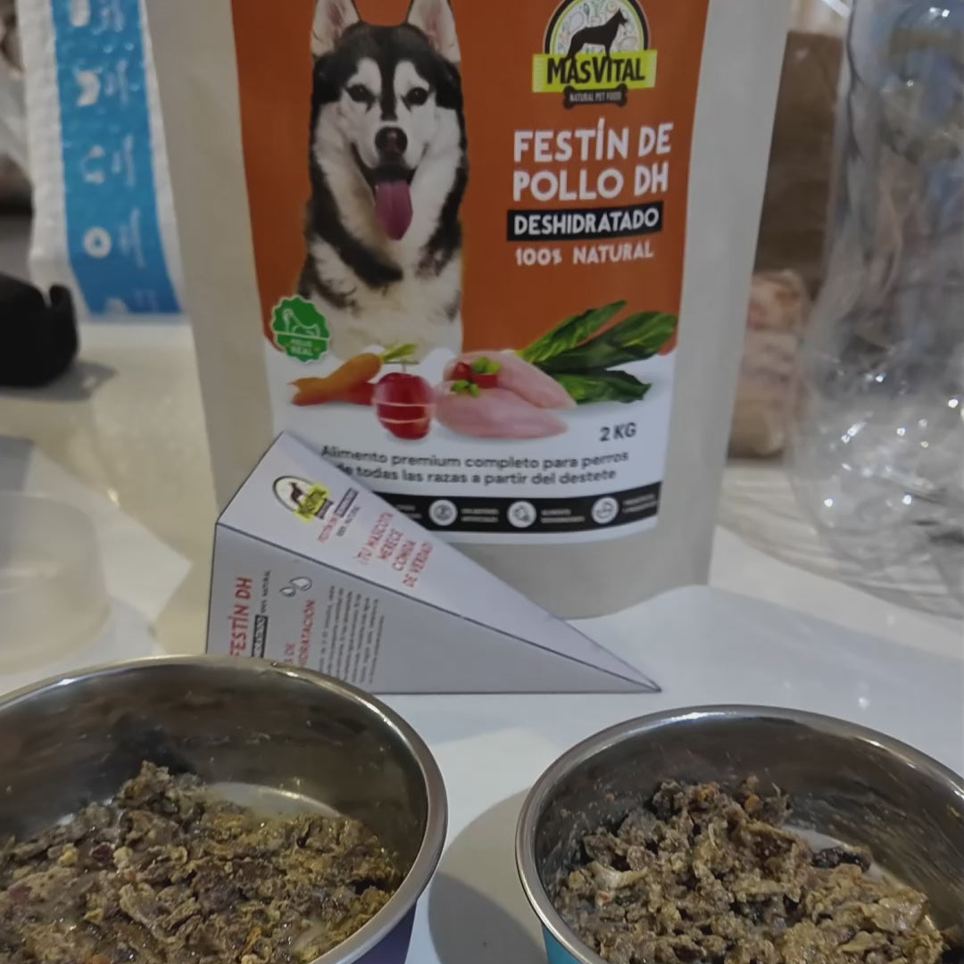 MasVital Festín de Pollo DH es un alimento completo, y 100% Natural, que ha sido sometido a un cuidadoso proceso de deshidratación con aire caliente a bajas temperaturas a partir de materias primas 100% naturales, sin conservantes ni aditivos artificiales. Sus principales características son:
